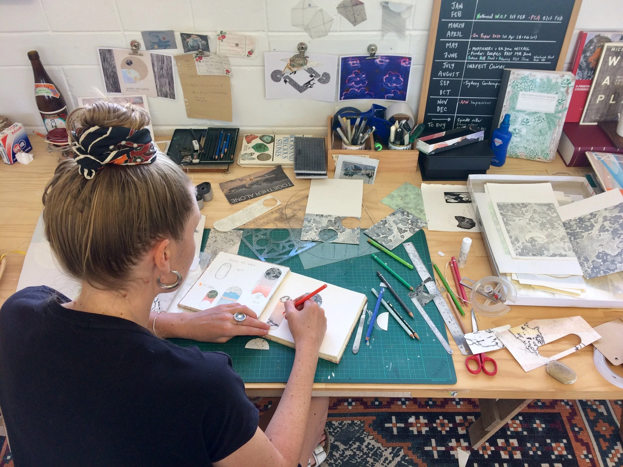 Lauren Jaye Carter is an artist and printmaker based in Cairns/Gimuy, Far North Queensland, originally from the South Coast of New South Wales. Working across linocut, monotype, hand-colouring, and collage, she creates delicate, layered constructions that combine organic forms with sharp edges, echoing surface textures drawn from elemental materials. Her prints reflect an intuitive reimagining of overlooked or ephemeral details, arranged within abstract, aggregate frameworks. Carter’s unique state prints explore the self-constructive nature of perception and the interplay between material process and sensory experience.